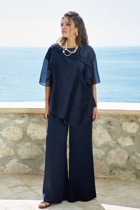 Широкие брюки глубокого синего оттенка, свободно свисают, создавая плавные линии и элегантную силуэтность. Ткань, из которой они выполнены, обладает текстурой, придавая образу нотку роскоши и комфорта. Брюки идеально подчеркивают фигуру, создавая стильный и уверенный вид. Брюки свободного силуэта, расширяются к низу. Пояс притачной на резинке, что обеспечивает максимально удобную посадку на любой тип фигуры, в боковых швах карманы. Длина брюк 108 см.