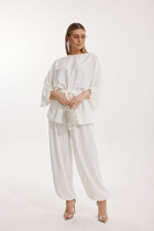 Брюки женские из гладкокрашеного фактурного полотна длинные, широкие по всей длине, на притачном поясе с эластичной тесьмой внутри, с карманами в боковых швах. Модным элементом является широкая подгибка нижних срезов.