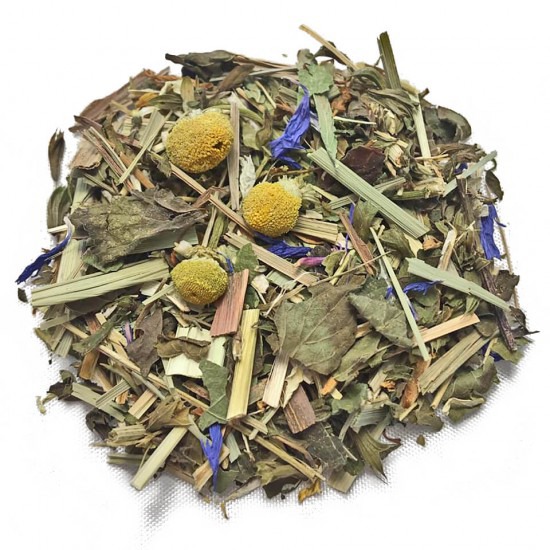 Мелисса, зверобой, лемонграсс, листья ежевики, листья мяты, цветы ромашки, лепестки василька