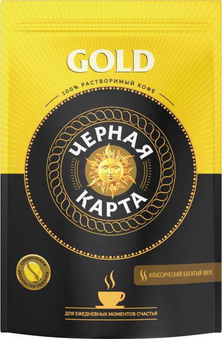 «Черная Карта» Gold – натуральный растворимый сублимированный кофе с особой золотистой обжаркой зёрен. Изысканный, с глубоким и сбалансированным вкусом и неповторимым богатым ароматом.
