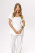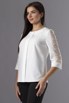 Блузка из вискозного трикотажного полотна пике, свободного кроя. Втачной короткий рукав. Отложной воротник со стойкой, спереди цельнокроеная планка на пуговицах. Боковые разрезы.