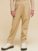 Базовые брюки без карманов, по низу удобные манжеты из кашкорсе. Модель из футера с лайкрой. Пояс регулируется шнуром.