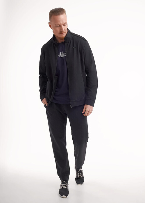 Брюки мужские на манжете из трикотажного полотна с регулируемой талией. Функциональность модели придают боковые карманы,а интересным акцентом в изделии является имиджевый принт и задний рез. Брюки эргономичные и удобные.