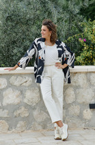 Брюки зауженные из трикотажного полотна джерси. Карманы листочка с отрезным бочком. По переду гульфик с застежкой на молнию. По талии спинки жаккардовая резинка. По низу брюк вытачки, нашивка металл.