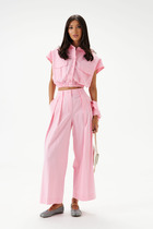 Брюки прямые с ц/в поясом спереди и притачным поясом по спинке. 5 шлевок. Спереди карманы, гульфик, застежка на молнию и 2 пуговицы. По спинке вытачки, листочки. Заутюженные стрелки спереди и на спинке.