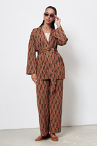 Брюки прилегающего силуэта из трикотажного полотна с мехом. По талии пояс. По спинке кокетка и накладные карманы. Спереди нефункциональные карманы и ложный гульфик. По переду вдоль лосин защип-имитация лампаса. По деталям двойная отстрочка.