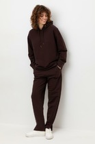 Брюки из хлопкового трикотажного полотна футер, прямые. По талии притачной пояс на резинке, по низу изделия подгибка с внутренней резинкой.
