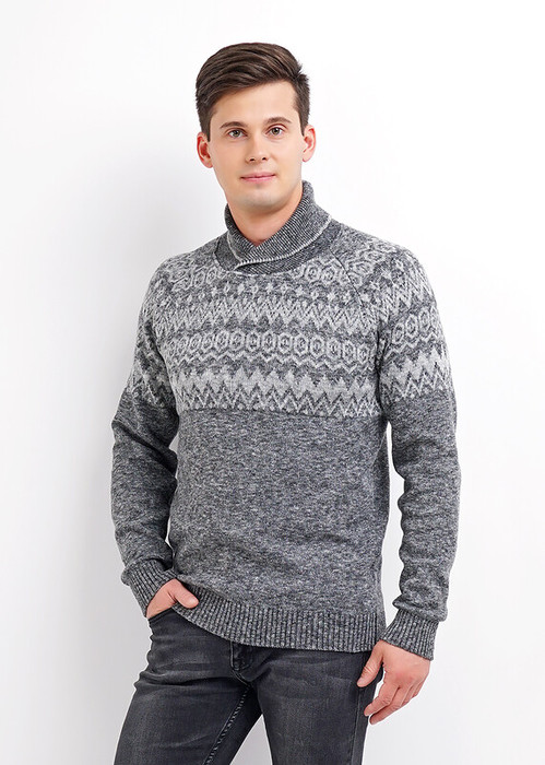 Мужской вязаный джемпер из смесовой пряжи с эстетичным узором на уровне плеч. Благодаря шалевому воротнику модель будет удерживать тепло, а комбинация с рубашкой и брюками сделает деловой образ более лаконичным и завершенным.