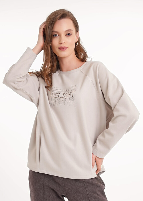 Джемпер объёмный из поливискозного трикотажного полотна джерси. Длинный рукав реглан. Округлая горловина с обтачкой. По низу переда складки,по низу спинки изделия внутренняя резинка. Спереди стразы.