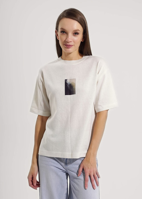 Вязаный джемпер умеренного объема из хлопковой пряжи с добавлением акрила. Короткий рукав со спущенной линией плеча. Длина рукава до локтя. Округлая горловина с бейкой. На детали переда нашивка.