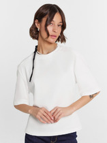 Джемпер свободного кроя из вискозного трикотажного полотна. Округлая горловина с обтачкой. Цельнокроеный рукав длиной 3/4. По переду и спинке отстроченные резы. По спинке средний шов. По бокам небольшие разрезы. Спереди принт фольга.