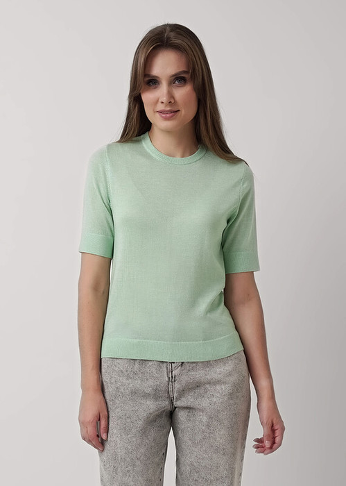 Вязаный джемпер прямого силуэта из вискозной пряжи с добавлением нейлона. Короткий втачной рукав. Основное переплетение гладь. Округлая горловина с бейкой. По низу изделия и рукавов манжеты.