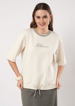 Вязаный джемпер прямого силуэта акриловой пряжи с добавлением хлопка, переплетение гладь. Короткий рукав реглан. Округлая горловина с полустойкой. По низу изделия и рукавов манжеты.