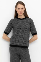 Вязаный джемпер прямого силуэта вискозной пряжи с добавлением нейлона. Основное переплетение разбор. Короткий втачной рукав. По горловине отложной воротник с планкой. По низу изделия и рукавов манжеты.