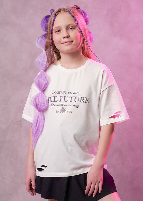 Стильная футболка с прорезями из хлопка с эластаном прекрасно дополнит твой гардероб. Модель кроя оверсайз дополнена эластичной горловиной и стильным принтом.Создавай стильные яркие образы,сочетая модель с юбкой или брюками из новой коллекции