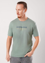 Футболка мужская из хлопкового полотна с эластаном, круглым вырезом горловины и коротким втачным рукавом. Оригинальность изделию придают контрастные канты по горловине и рукавам, а так же фактурный дизайнерский принт.