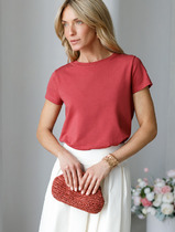 Футболка из хлопкового трикотажного полотна. Короткий спущенный рукав. Округлый вырез горловины с обтачкой из рибаны. По переду принт.
