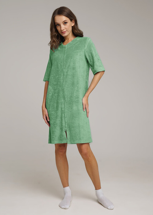 Халат махровый для дома с хлопоком в составе. Короткий втачной рукав. V-образный вырез горловины. Застежка на двухзамковую молнию. Карманы в боковых швах.
