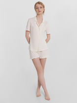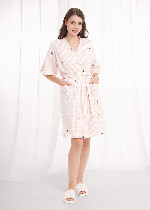 Халат из трикотажного полотна свободного кроя, на запах. По талии пояс со шлевками и внутренними завязками. По горловине и борту окантовка. Спущенная линия плеча, с коротким рукавом. По бокам накладные карманы. По низу рукава и изделия -рюша.