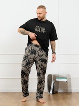 Комплект мужской состоящий из футболки и брюк. Футболка из трикотажного полотна в набивку с коротким рукавом и дизайнерской нашивкой. Брюки из трикотажного полотна на широком поясе с резинкой и регулируемым шнуром, по бокам удобные карманы.