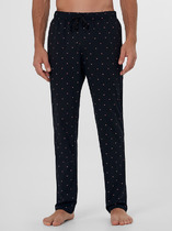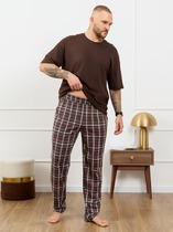 Комплект мужской состоящий из футболки и брюк. Футболка из трикотажного полотна с коротким рукавом и фигурной горловиной, спереди авторский принт. Брюки из трикотажа с набивкой на широком поясе с резинкой и регулируемым шнуром, по бокам удобные карманы.