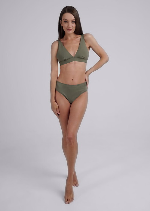 Костюм купальный женский однотонный из полиамида с эластаном, лиф с треугольными чашечками на регулируемых бретелях с магнитной застежкой, трусы бикини с высокой посадкой.