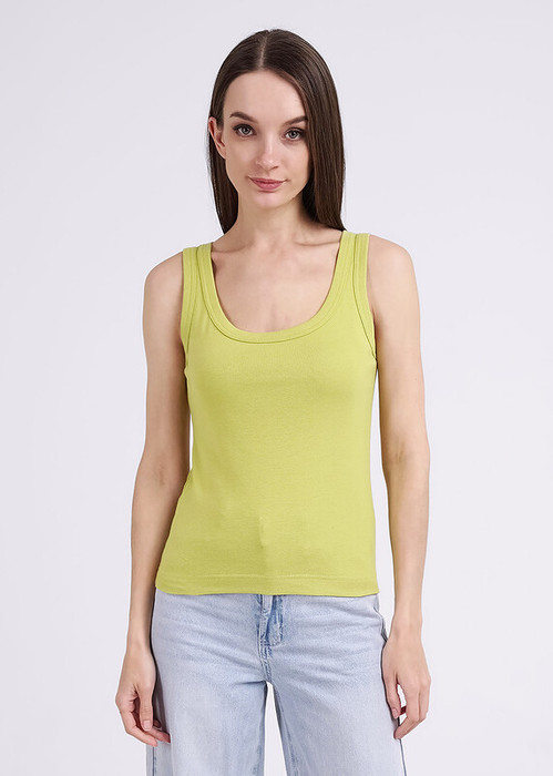 Майка из хлопкового трикотажного полотна рибана. Умеренный объем. Широкая бретель, округлая горловина. По горловине и пройме окантовка.