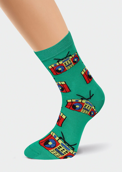 Стильные мужские носки зеленого цвета, с набивкой рисунка магнитофона . Выполнены из мягкого трикотажа, что не вызывает дискомфорта при носке, отлично сидят на ножке.