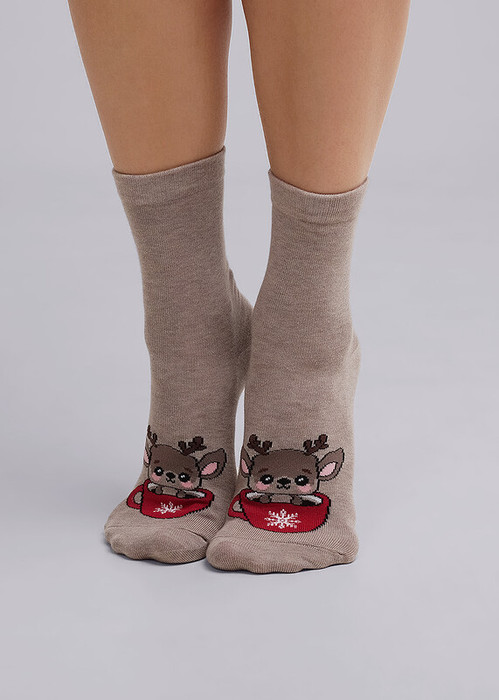 женские новогодние носки с рисунком оленёнок в кружке