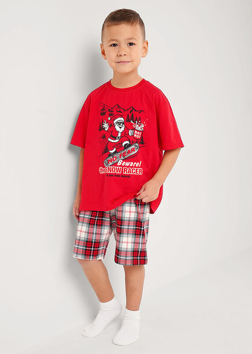 Новогодняя пижама для мальчика, состоящая из футболки и шорт. Стильная футболка свободного кроя дополнена оригинальным принтом. Шорты прямые средней длины с эластичным удобным поясом, выполнены из хлопкового полотна в клетку