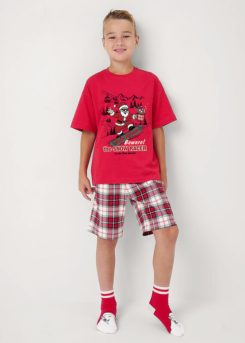 Новогодняя пижама для подростков, состоящая из футболки и шорт. Стильная футболка свободного кроя дополнена оригинальным принтом. Шорты прямые средней длины с эластичным удобным поясом, выполнены из хлопкового полотна в клетку.