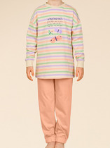 Комплект хлопковой пижамы из джемпера и брюк. Джемпер свободного кроя дополнен эластичной горловиной и манжетами. Брюки среднего объема, эластичный пояс обеспечит комфорт и идеальную посадку. По низу брюк эластичные манжеты.