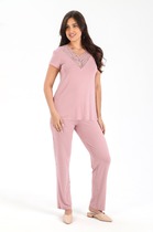 Пижама для дома и отдыха из хлопкового трикотажного полотна.Футболка прямого кроя, округлая горловина с обтачкой. Короткий втачной рукав. Спереди принт. Боковые разрезы. Бриджы прямого кроя, пояс на внутренней резинке. Боковые карманы с отрезным бочком.