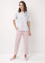 Пижама для дома и отдыха из трикотажного полотна с добавление модала.Футболка прямого кроя, короткий цельнокроенный рукав.Округлая горловина с обтачкой. Спереди принт,нашивка металл. Шорты с поясом на внутренней резинке.Боковые карманы с отрезным бочком.