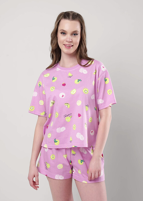 Пижама для дома из хлопкового трикотажного полотна. Футболка прямого кроя, округлая горловина с обтачкой из кашкорсе. По бокам разрезы. Короткий втачной рукав. Шорты прямого кроя, пояс на внутренней резинке.