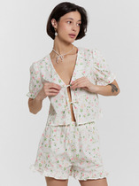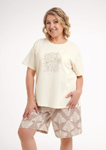 Пижама для дома из трикотажного полотна кашкорсе лапша. Майка укороченная. Узкая бретель. Округлый вырез горловины. По горловине и пройме окантовка.Спереди нашивка. По низу внутренняя резинка. Шорты прямого кроя, пояс на внутренней резинке, нашивка.