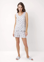 Пижама для дома из трикотажного полотна кашкорсе лапша. Майка укороченная. Узкая бретель. Округлый вырез горловины. По горловине и пройме окантовка.Спереди нашивка. По низу внутренняя резинка. Шорты прямого кроя, пояс на внутренней резинке, нашивка.