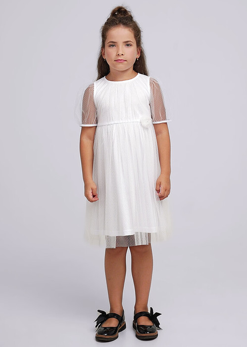 Нарядное двухслойное платье для девочки. Объемные рукава выполнены из сетки с узором. Нижний слой платья - из кулирки 100% хлопок, верхний слой - из сетки, как на рукавах. Сзади платья функциональная атласная лента.