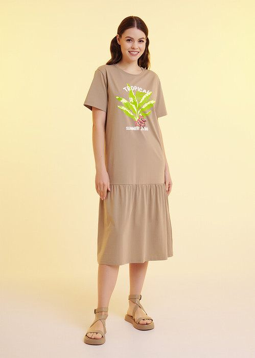 Платье для дома и отдыха из хлопкового трикотажного полотна,прямого силуэта. Втачной короткий рукав, внизу термонаклейка силикон. Округлая горловина с обтачкой. По низу изделия отрезная юбка, собрана на сборку. Спереди принт,вышивка.