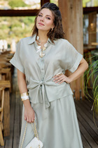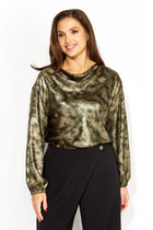 Куртка прямого силуэта из трикотажного полотна джерси. Отложной воротник на стойке. По переду планка с застежкой на пуговицы, на спинке кокетка с бантовой складкой. Длинный рукав со спущенной линией плеча, внизу манжет на пуговице. Фигурный низ изделия.