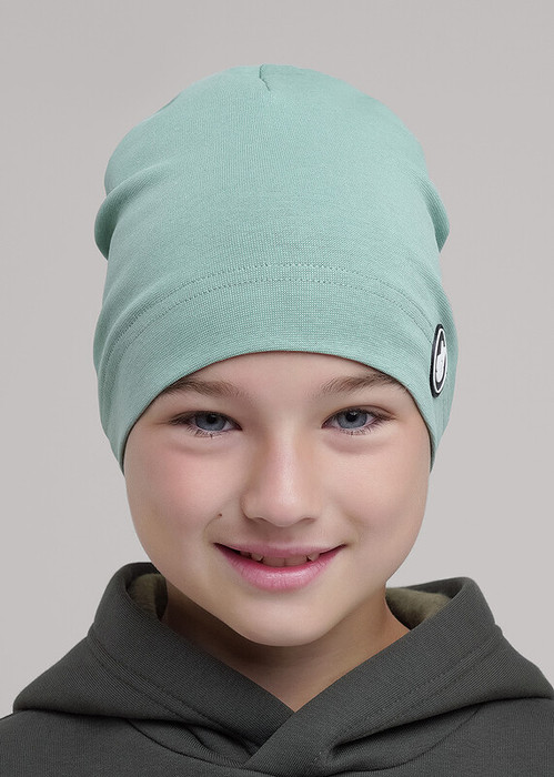 Шапка однослойная без отворота. Декорирована стильной нашивкой. Стильная шапка подойдет для активного отдыха, на прогулку, как головной убор в детский сад. Размер 52-54