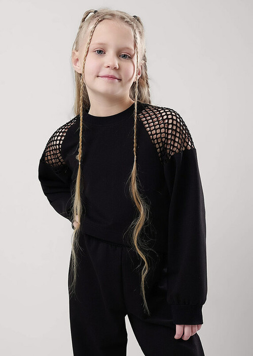 Стильный укороченный свитшот станет модной новинкой в твоем гардеробе! Модель дополнена вставками из крупной сетки. Сочетай свитшот с брюками или юбкой из новой коллекции и создавай яркие неповторимые образы на каждый день!