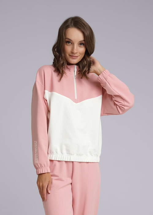 Джемпер комбинированный из эластичного футера 2х нитки. Длиный рукав со спущенной линией плеча. Воротник стойка с застежкой на молнию. По переду и спинке отрезные кокетки. Низ изделия и рукавов на манжете с резинкой. Принт на правом рукаве.