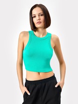 Майка топ укороченная из трикотажного полотна кашкорсе лапша с эластаном. Средняя ширина бретели. Округлый вырез горловины. По горловине, пройме окантовка. По низу изделия внутренняя резинка, по центру жаккардовая нашивка.