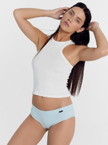 Трусы бикини женские из эластичного хлопкового полотна. Обработка краев по талии окантовочная резинка, по ноге узкая резинка с застилом (сверху). Спереди резы обработка зубы.