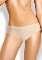 Трусы-шорты женские из эластичного хлопкового полотна. Спинка из эластичной сетки со средним швом. Обработка краев по талии - окантовка, по ноге переда - подгибка, по ноге спинки - узкое кружево.