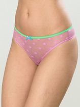 Трусы стринги женские из эластичного хлопкового полотна. Обработка краев по талии - жаккардовая резинка, по ноге - полуокантовка. Спереди боковые вставки из сетки.