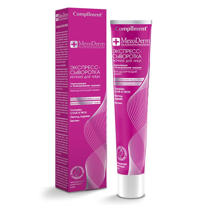 Инновационная Экспресс-Сыворотка Compliment Mezoderm специально разработана для усиленного питания и омоложения кожи лица в ночное время суток, когда клетки дермы находится в спокойном расслабленном состоянии во время сна.