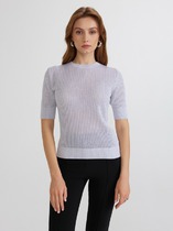 Джемпер женский из трикотажного полотна, комбинированный. Рукав длинный. Спинка выполнена из отделочного полотна. Горловина круглая, по низу джемпера и низу рукавов пришиты манжеты. На уровне груди, с левой стороны прикреплена брошь.