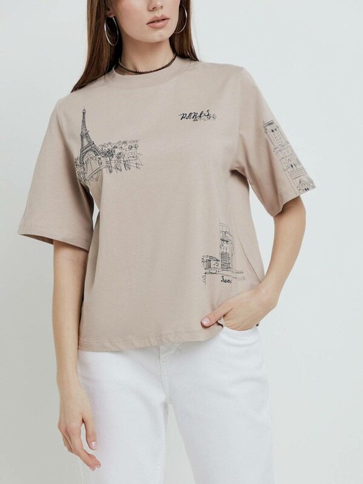 Oversize-футболка «Paris» станет основой для множества расслабленных базовых образов. · oversize· круглый вырез горловины с планкой в рубчик· рукава до локтя· печатный рисунок «Paris»· 100% хлопок· сохранение формы при соблюдении рекомендаций по уходу· создана для стильных расслабленных образов.